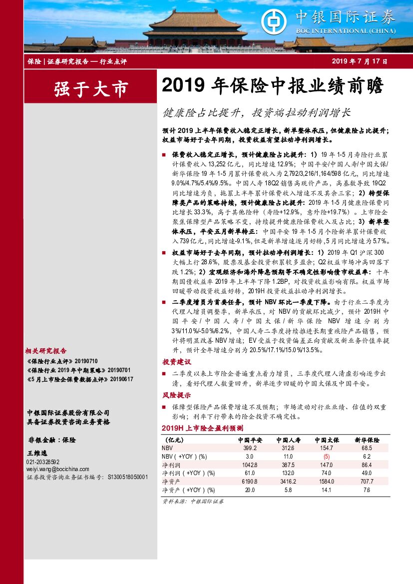 中银国际:2019年保险中报业绩前瞻:健康险占比提升,投资端拉动利润增长.pdf