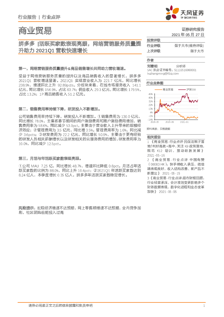 天风证券:商业贸易:拼多多|活跃买家数表现亮眼,网络营销服务质量提升助力2021Q1营收快速增长.pdf