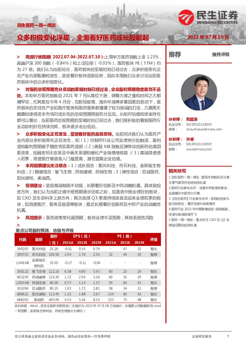 民生证券:民生医药一周一席谈:众多积极变化浮现,全面看好医药成长股崛起.pdf