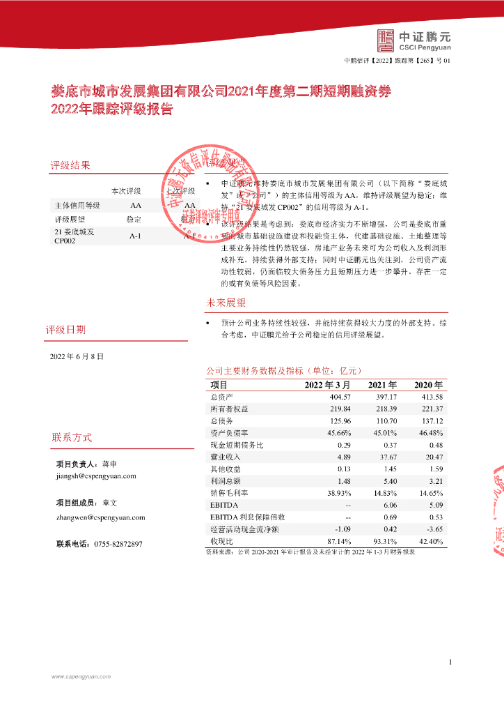 鹏元:娄底市城市发展集团有限公司2021年度第二期短期融资券2022年跟踪评级报告.pdf