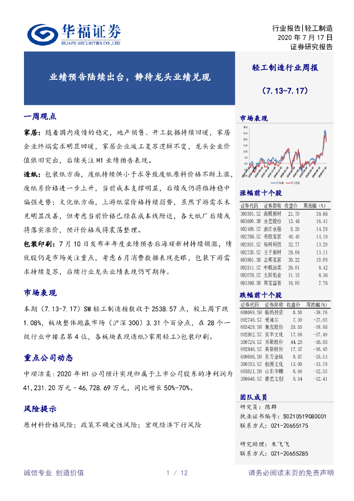 华福证券:轻工制造行业周报:业绩预告陆续出台,静待龙头业绩兑现.pdf