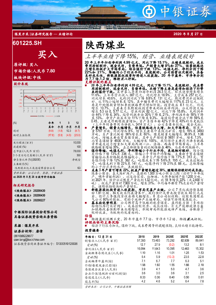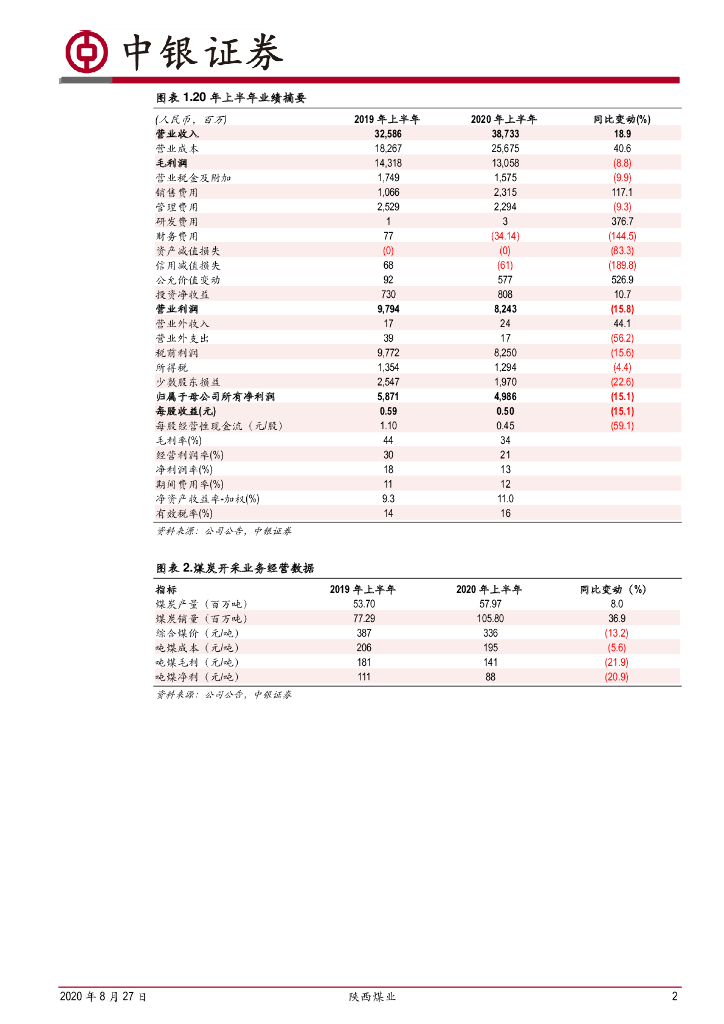 中银证券:陕西煤业(601225)-上半年业绩下降15%,经营、业绩表现较好.pdf
