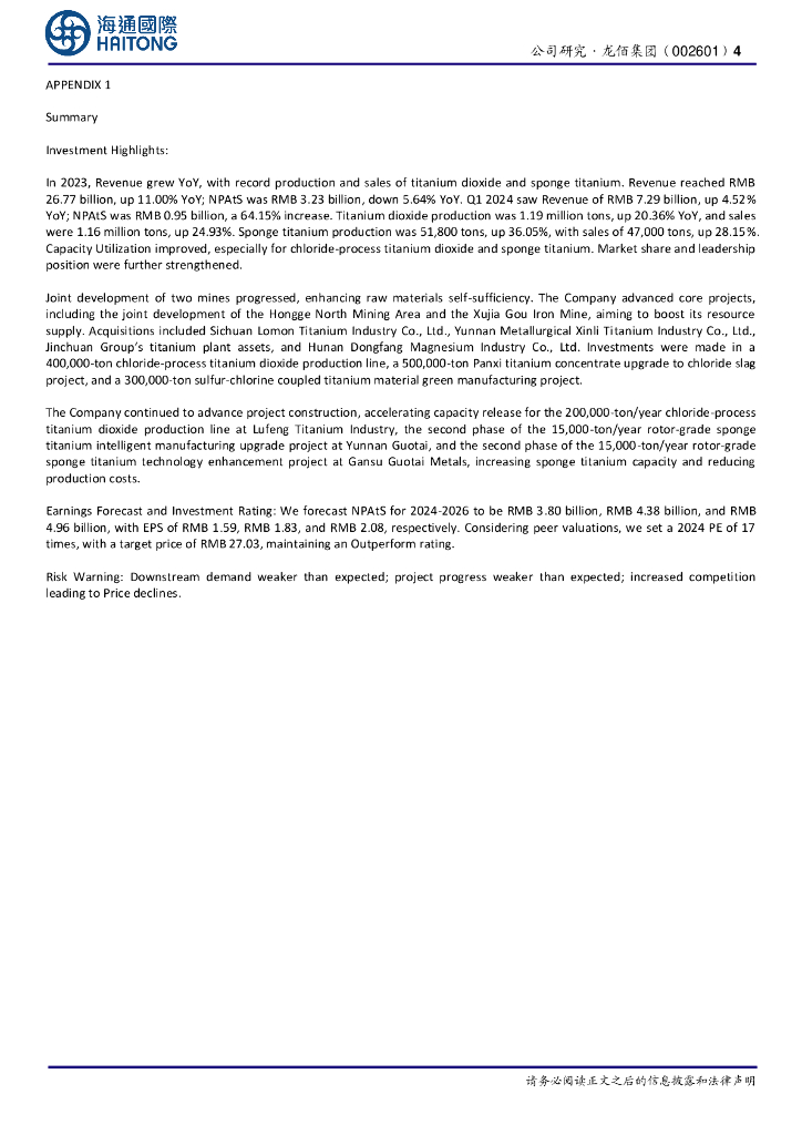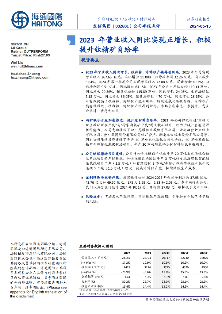 海通国际:龙佰集团(002601)-公司年报点评:2023年营业收入同比实现正增长,积极提升钛精矿自给率.pdf