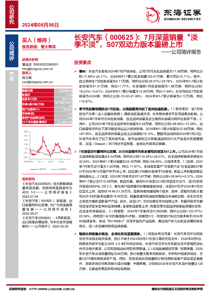 东海证券:长安汽车(000625)-公司简评报告:7月深蓝销量“淡季不淡”,S07双动力版本重磅上市.pdf