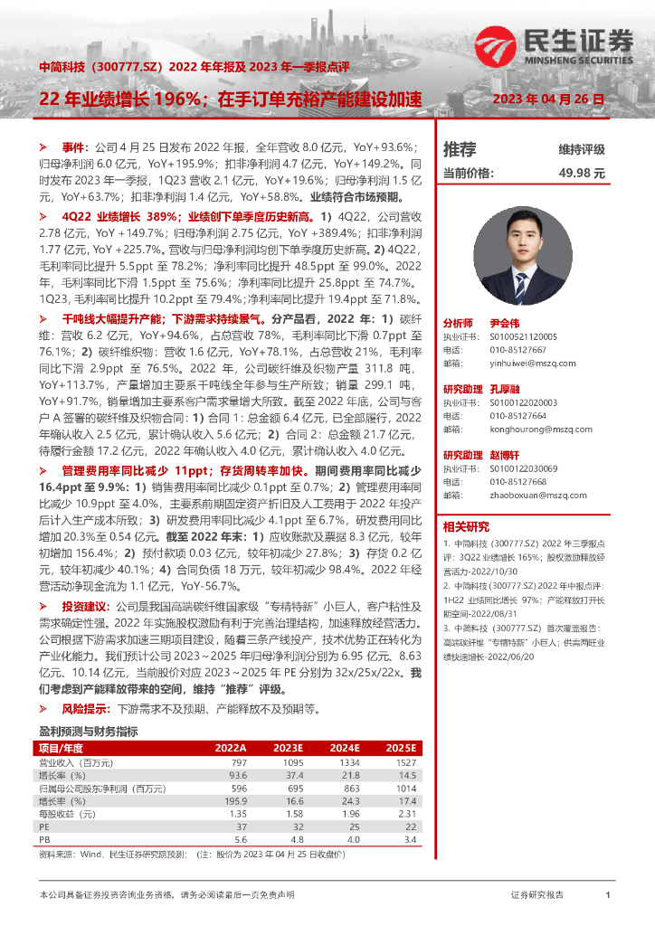 民生证券:中简科技(300777)-2022年年报及2023年一季报点评:22年业绩增长196%;在手订单充裕产能建设加速.pdf
