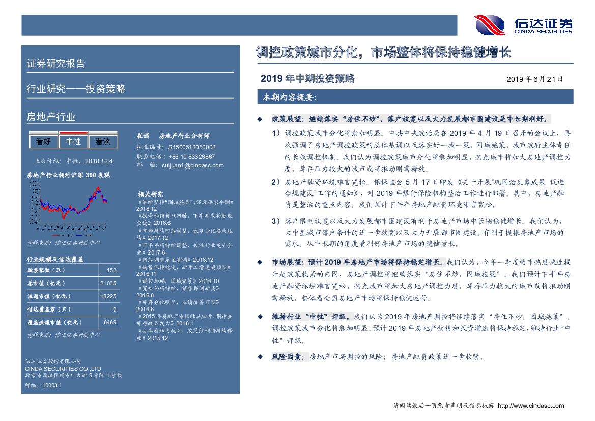 信达证券:房地产行业2019年中期投资策略:调控政策城市分化,市场整体将保持稳健增长.pdf