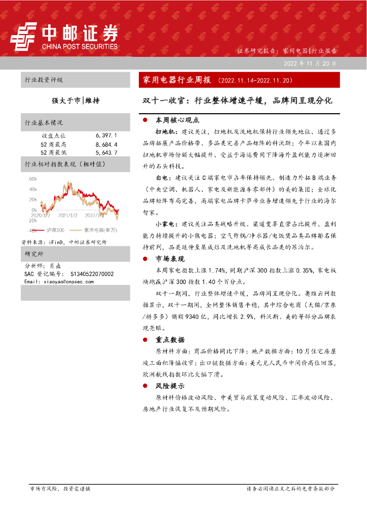 中邮证券:家用电器行业周报:双十一收官:行业整体增速平缓,品牌间呈现分化.pdf