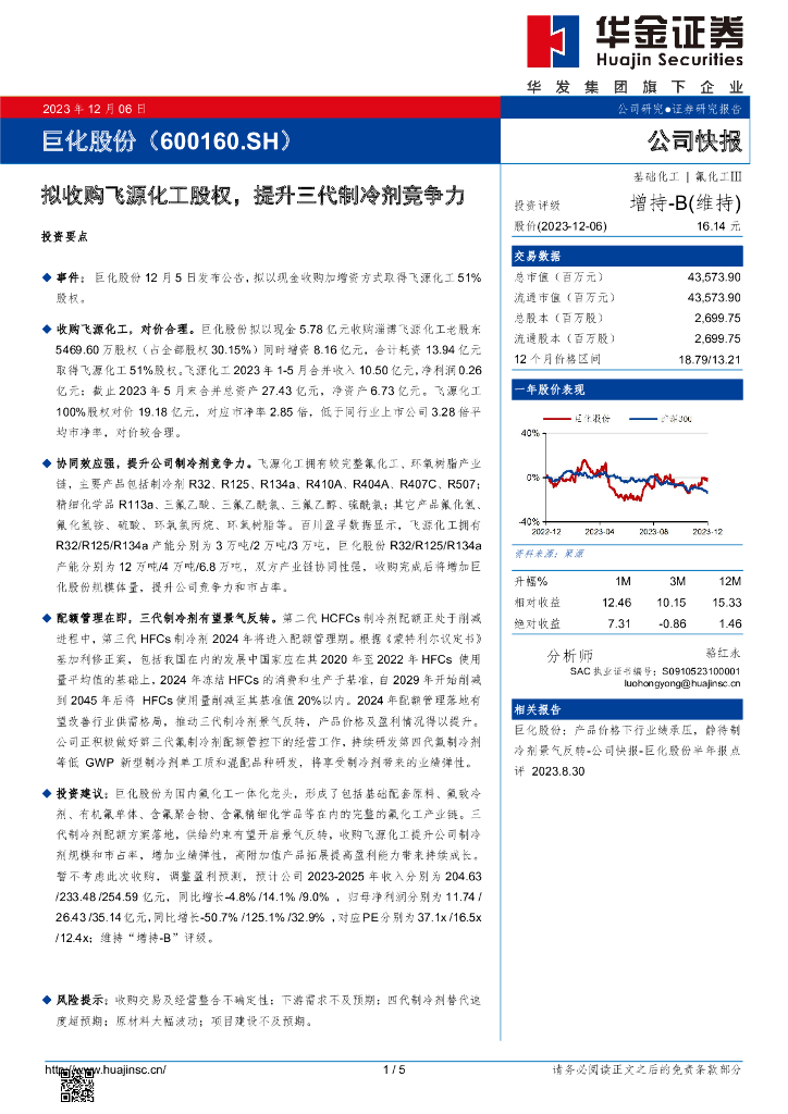 华金证券:巨化股份(600160)-拟收购飞源化工股权,提升三代制冷剂竞争力.pdf