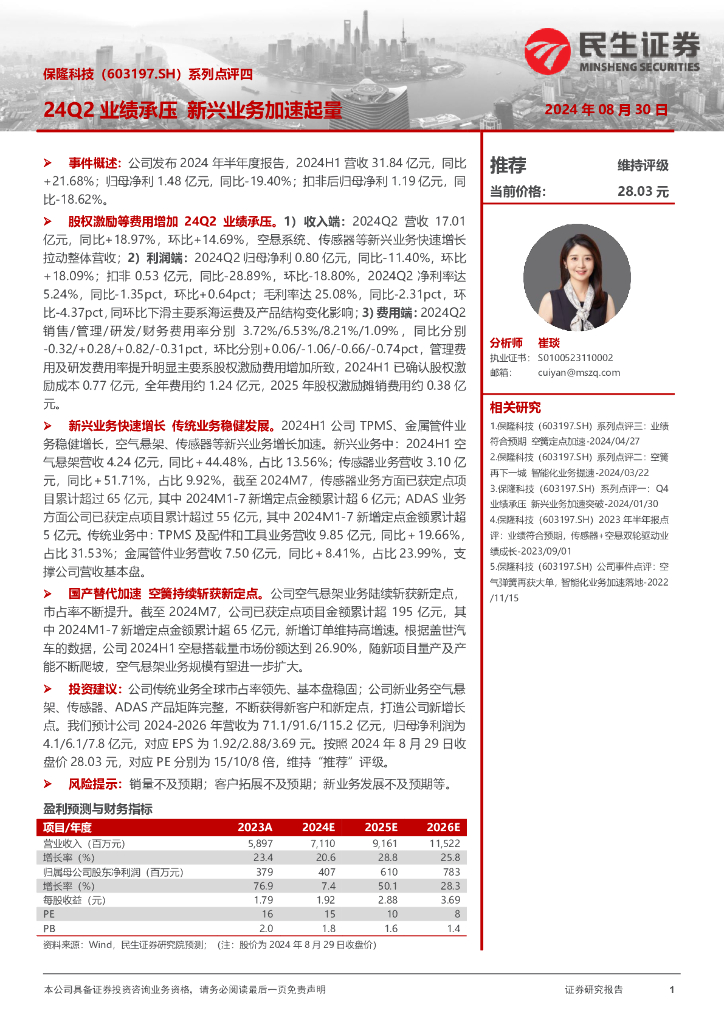 民生证券:保隆科技(603197)-系列点评四:24Q2业绩承压新兴业务加速起量.pdf