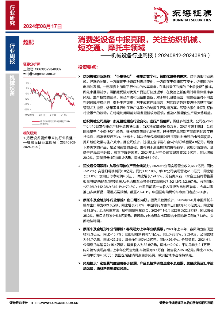 东海证券:机械设备行业周报:消费类设备中报亮眼,关注纺织机械、短交通、摩托车领域.pdf