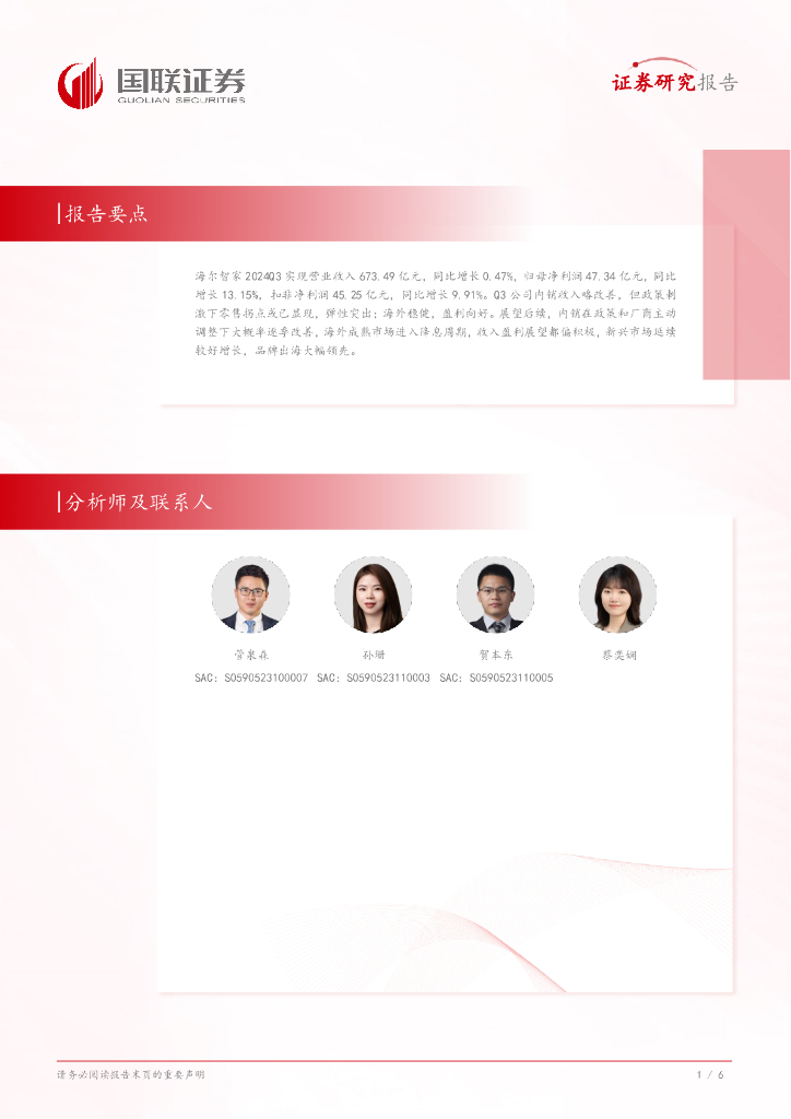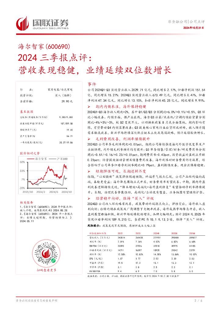 国联证券:海尔智家(600690)-2024三季报点评:营收表现稳健,业绩延续双位数增长.pdf