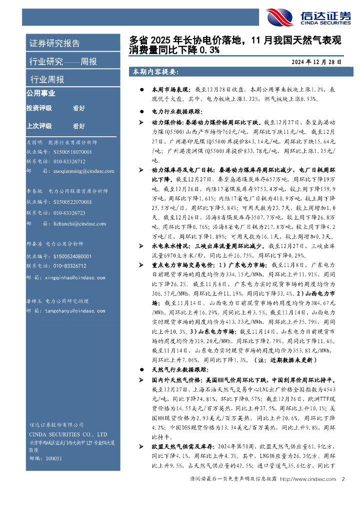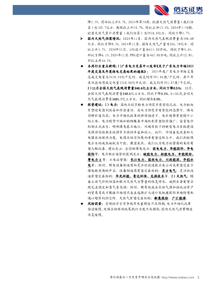 信达证券:公用事业—电力天然气周报:多省2025年长协电价落地,11月我国天然气表观消费量同比下降0.3%.pdf