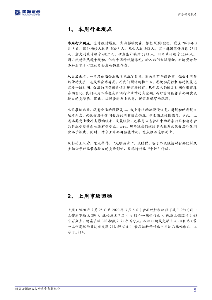 国海证券:食品饮料行业周报:全球疫情爆发负面影响仍在,维持推荐必选食品和休闲食品.pdf