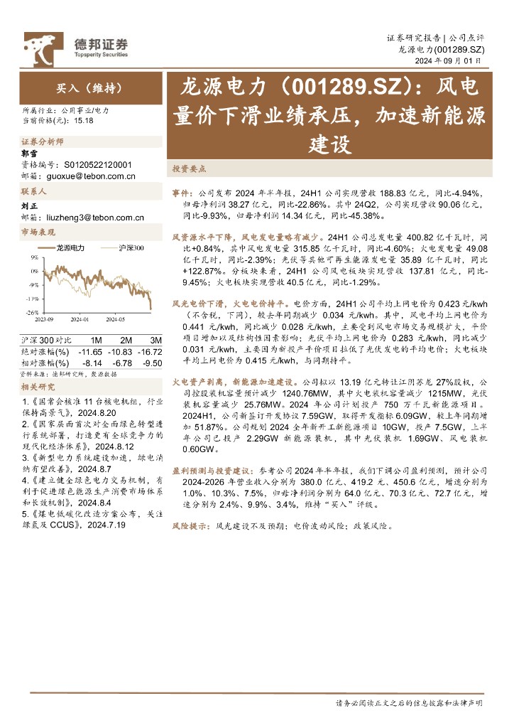 德邦证券:龙源电力(001289)-风电量价下滑业绩承压,加速新能源建设.pdf