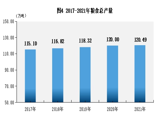 全年粮食播种面积342681公顷,比上年增长0.1%;粮食产量达120.49万吨,比上年增长0.4%。