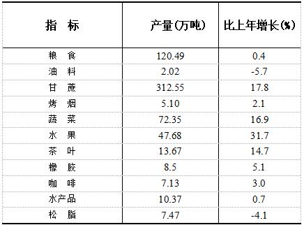 全年茶叶产量13.67万吨,增长14.7%;油料产量2.02万吨,下降5.7%;烤烟产量5.10万吨,增长2.1%;蔬菜产量72.35万吨,增长16.9%;水果产量47.68万吨,增长31.7%;咖啡产量7.13万吨,增长3.0%;水产品产量10.37万吨,增长0.7%;全年木材产量363.67万立方米,增长49.6%。