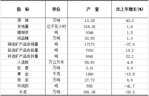 全年规模以上工业增加值中,有色金属矿采选业增加值比上年下降12.5%,农副食品加工业下降1.1%,酒、饮料和精制茶制造业增长4.9%,木材加工和木、竹、藤、棕、草制品业增长1.8%,造纸和纸制品业下降21.4%,化学原料和化学制品制造业增长5.9%,医药制造业下降18.1%,非金属矿物制品业下降21.9%,有色金属冶炼和压延加工业下降14.2%,电力、热力生产和供应业增长12.9%。