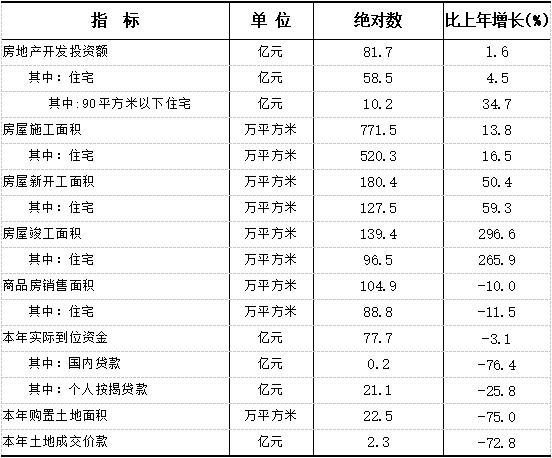 全年房屋施工面积 771.5万平方米,比上年增长13.8%;房屋竣工面积139.4万平方米,增长3.0倍;商品房销售面积104.9万平方米,下降10.0%;商品房销售额 63.3亿元,下降11.6%。