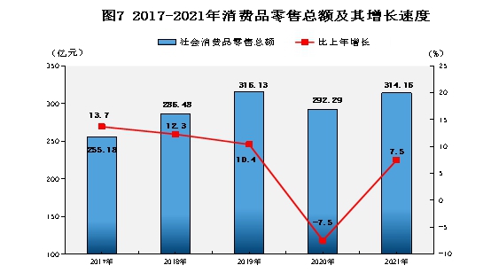 全年社会消费品零售总额314.16亿元, 比上年增长7.5%。按经营地统计,城镇消费品零售额263.89亿元,增长7.9%;乡村消费品零售额50.27亿元,增长5.2%。按消费形态统计,商品零售额269.00亿元,增长8.7%;餐饮收入45.16亿元,增长0.8%。