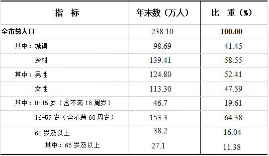 年末全市常住人口238.10万人。出生率为8.32 ‰,死亡率为7.06 ‰;自然增长率为1.26 ‰。年末全市城镇人口98.69万人,乡村人口139.41万人,全市城镇化率41.45%。