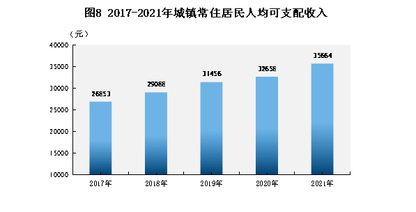 全年城镇常住居民人均可支配收入35664元,比上年增长9.2%;农村常住居民人均可支配收入13682元,比上年增长10.6%。城镇常住居民人均生活消费支出24204元,比上年增长10.4%;农村常住居民人均生活消费支出12240元,比上年增长10.9%。