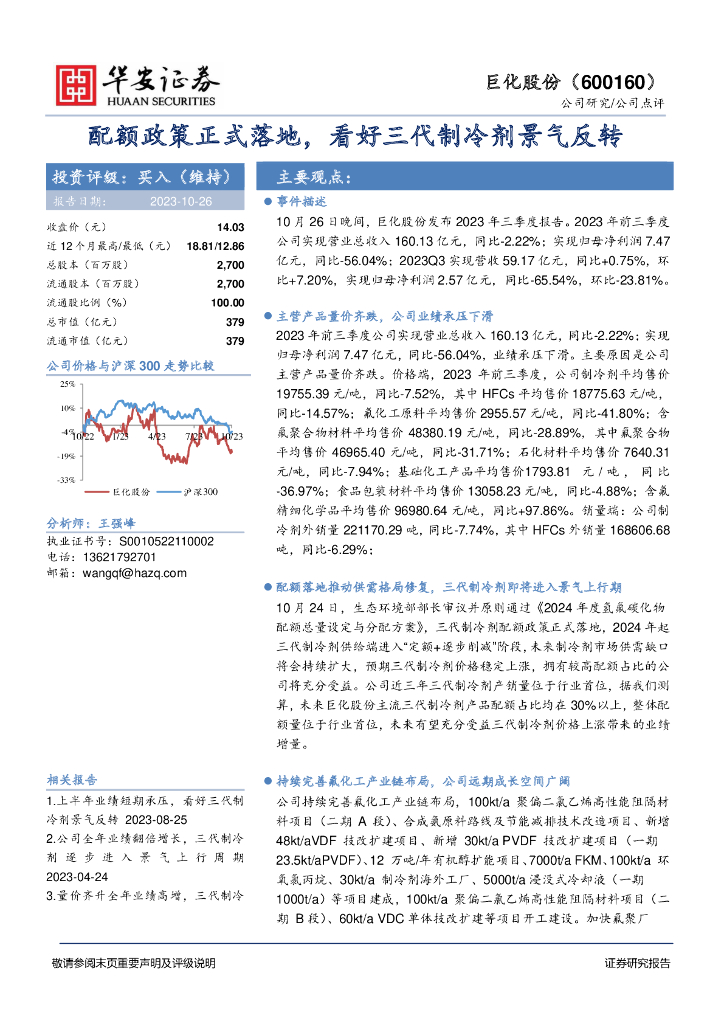 华安证券:巨化股份(600160)-配额政策正式落地,看好三代制冷剂景气反转.pdf