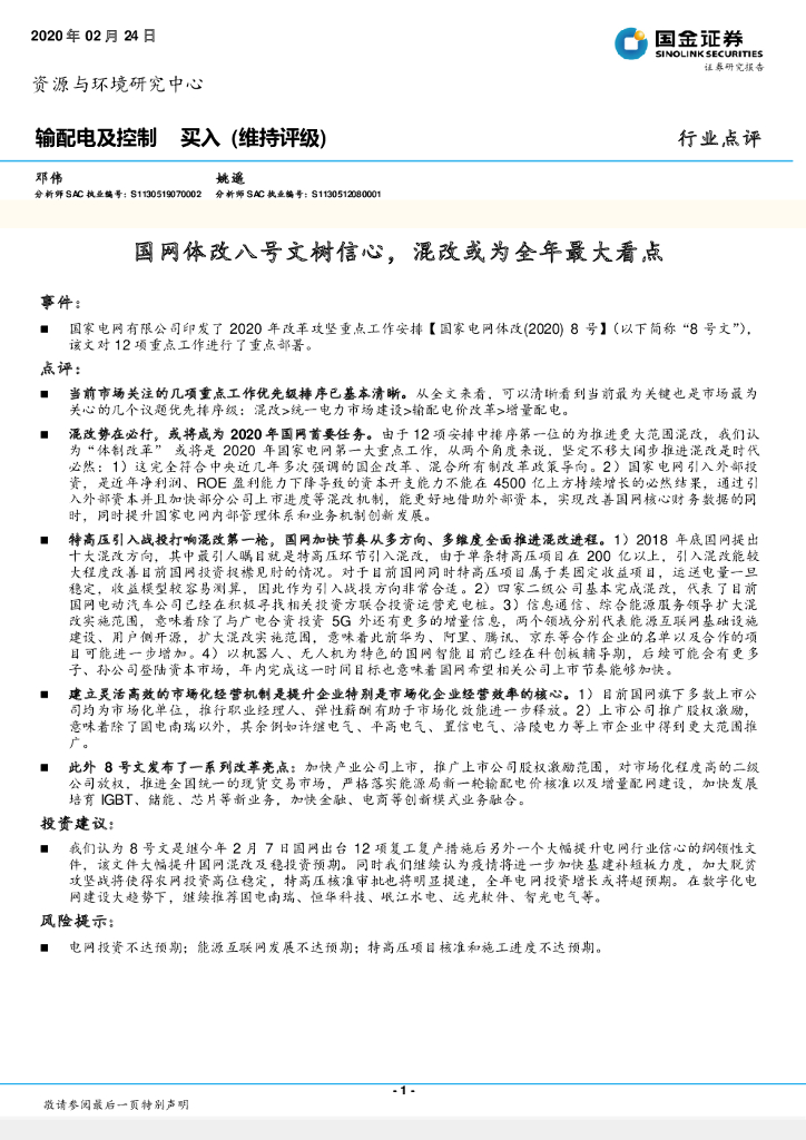 国金证券:输配电及控制行业点评:国网体改八号文树信心,混改或为全年最大看点.pdf