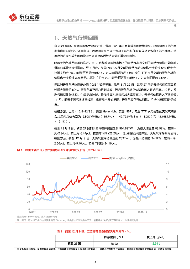 东方证券:公用事业行业:欧美能源市场数据跟踪周报-OPEC+维持减产、欧盟限价措施生效,油价跌至年内新低;欧洲天然气价格上涨.pdf