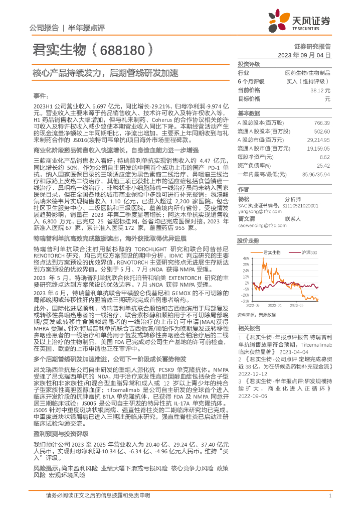 天风证券:君实生物(688180)-核心产品持续发力,后期管线研发加速.pdf