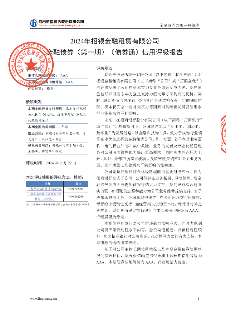 联合资信:2024年招银金融租赁有限公司金融债券(第一期)(债券通)信用评级报告及跟踪评级安排.pdf