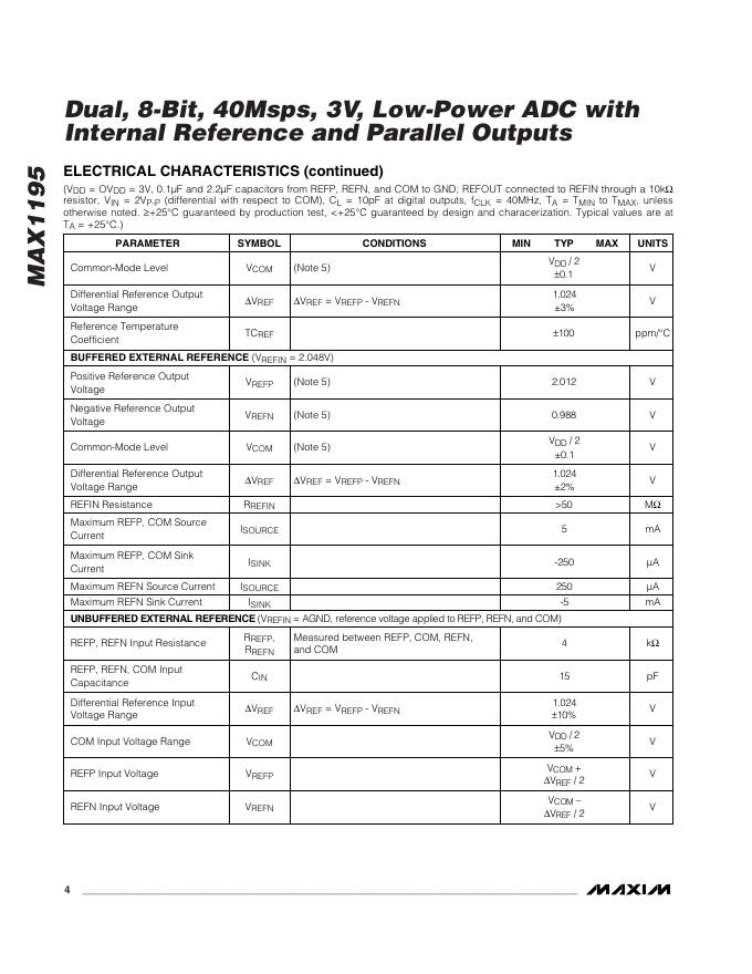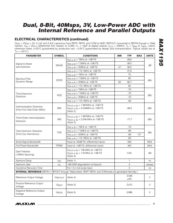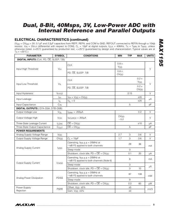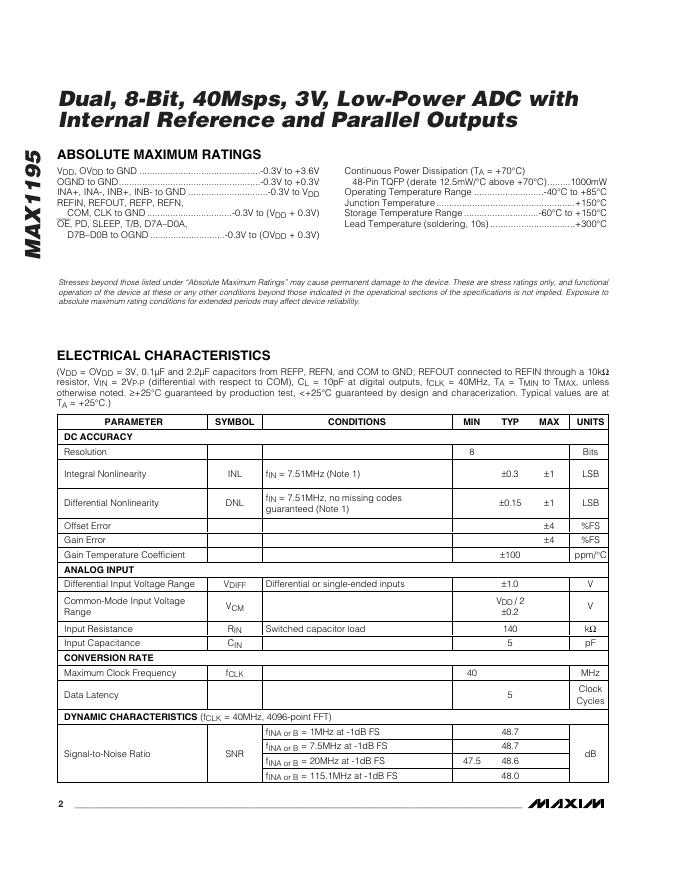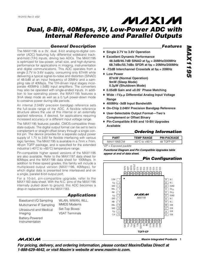 MAXIM MAX1195 Dual, 8-Bit, 40Msps, 3V, Low-Power ADC with Internal Reference and Parallel Outputs 数据手册.pdf