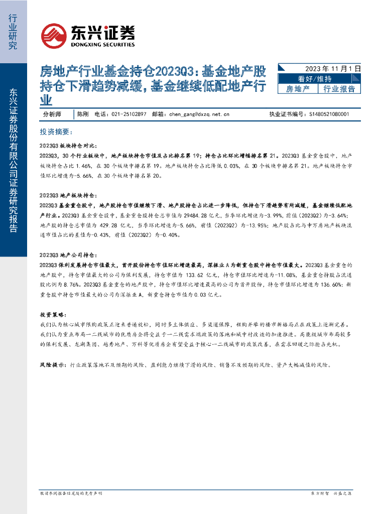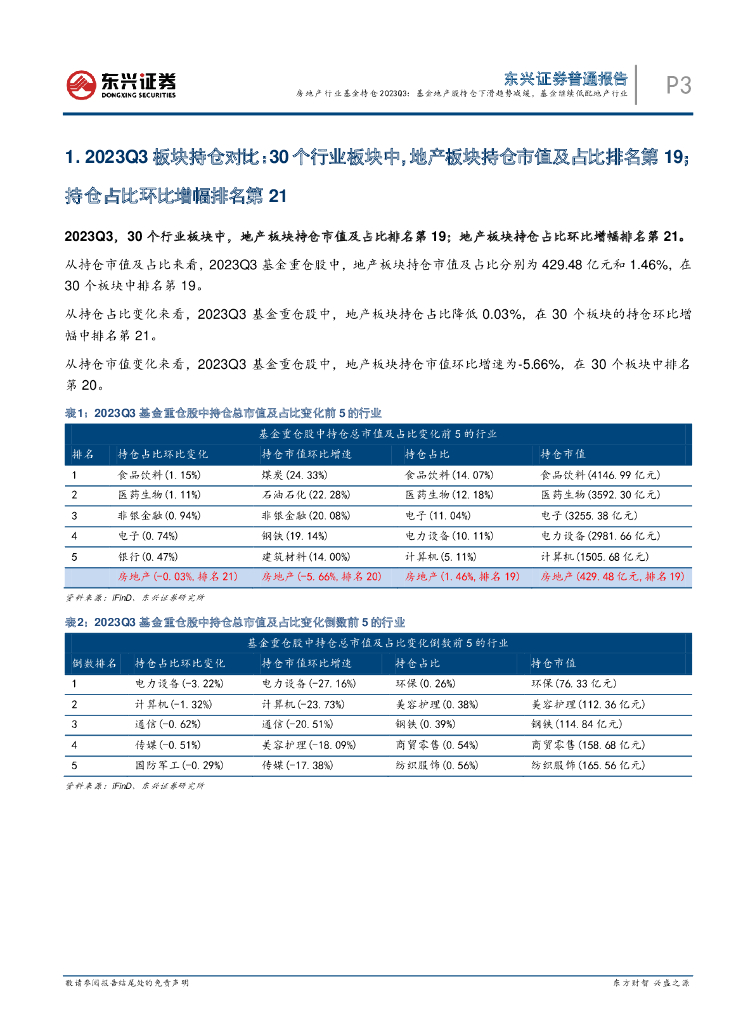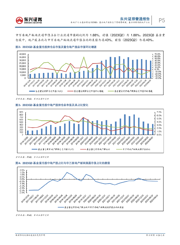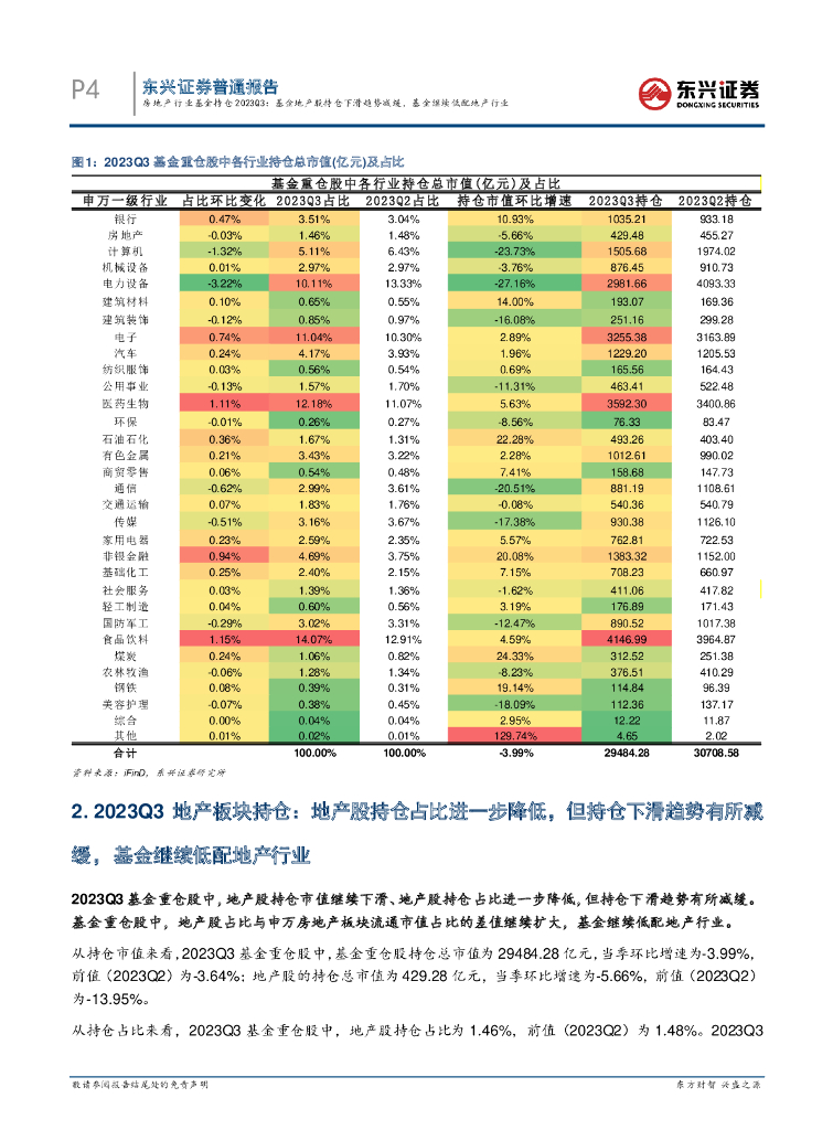 东兴证券:房地产行业基金持仓2023Q3:基金地产股持仓下滑趋势减缓,基金继续低配地产行业.pdf