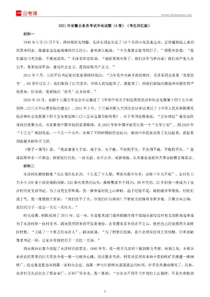 2021年安徽公务员考试申论试题(A卷)(考生回忆版).pdf