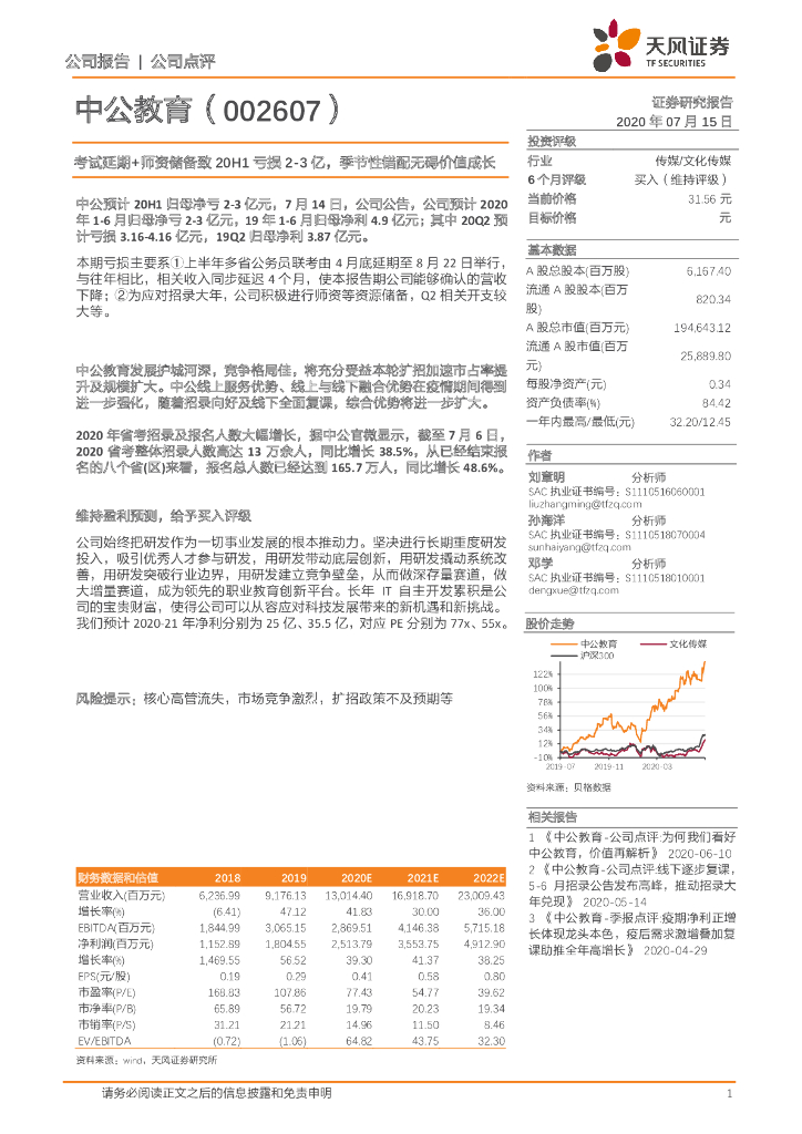 天风证券:中公教育(002607)-考试延期+师资储备致20H1亏损2-3亿,季节性错配无碍价值成长.pdf