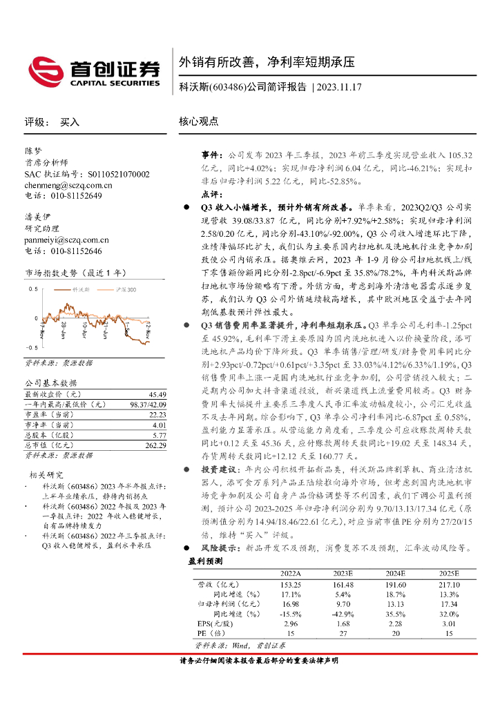 首创证券:科沃斯(603486)-公司简评报告:外销有所改善,净利率短期承压.pdf