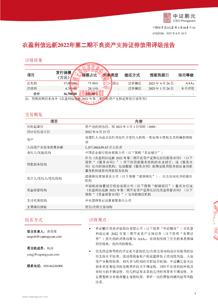 鹏元:农盈利信远新2022年第二期不良资产支持证券信用评级报告及跟踪评级安排(中证鹏元).pdf