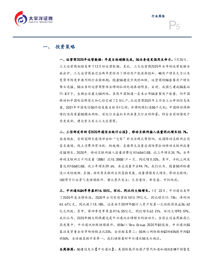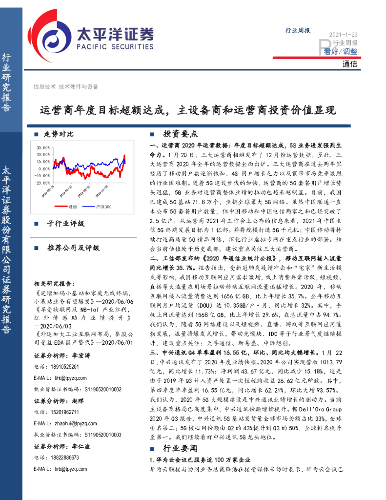 太平洋证券:通信行业周报:运营商年度目标超额达成,主设备商和运营商投资价值显现.pdf