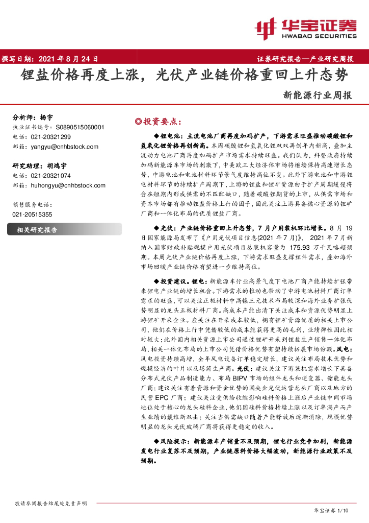 华宝证券:新能源行业周报:锂盐价格再度上涨,光伏产业链价格重回上升态势.pdf