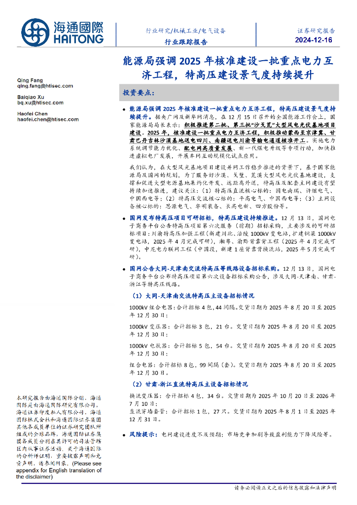 海通国际:电气设备行业跟踪报告:能源局强调2025年核准建设一批重点电力互济工程,特高压建设景气度持续提升.pdf