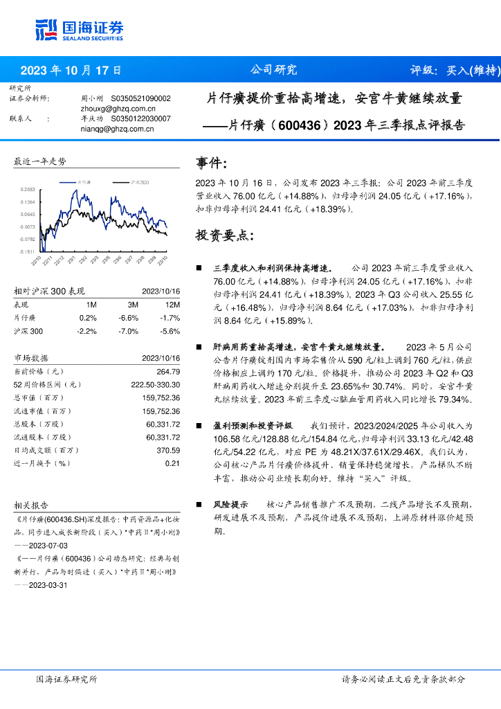 国海证券:2023年三季报点评报告:片仔癀提价重拾高增速,安宫牛黄继续放量.pdf
