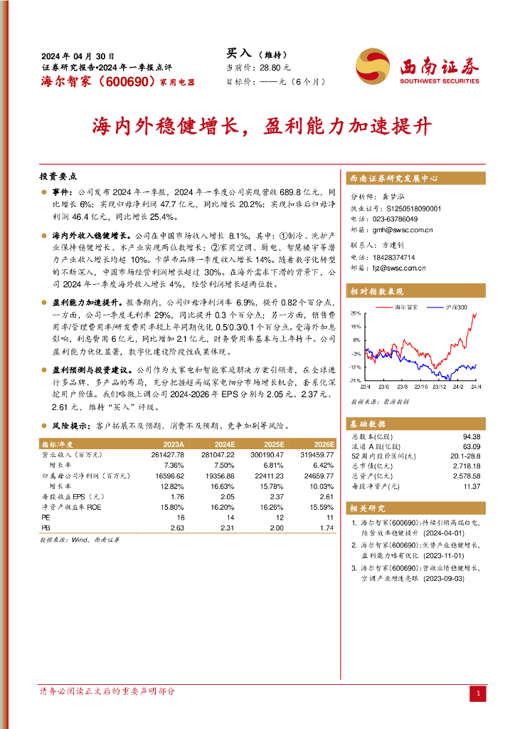 西南证券:海尔智家(600690)-2024年一季报点评:海内外稳健增长,盈利能力加速提升.pdf