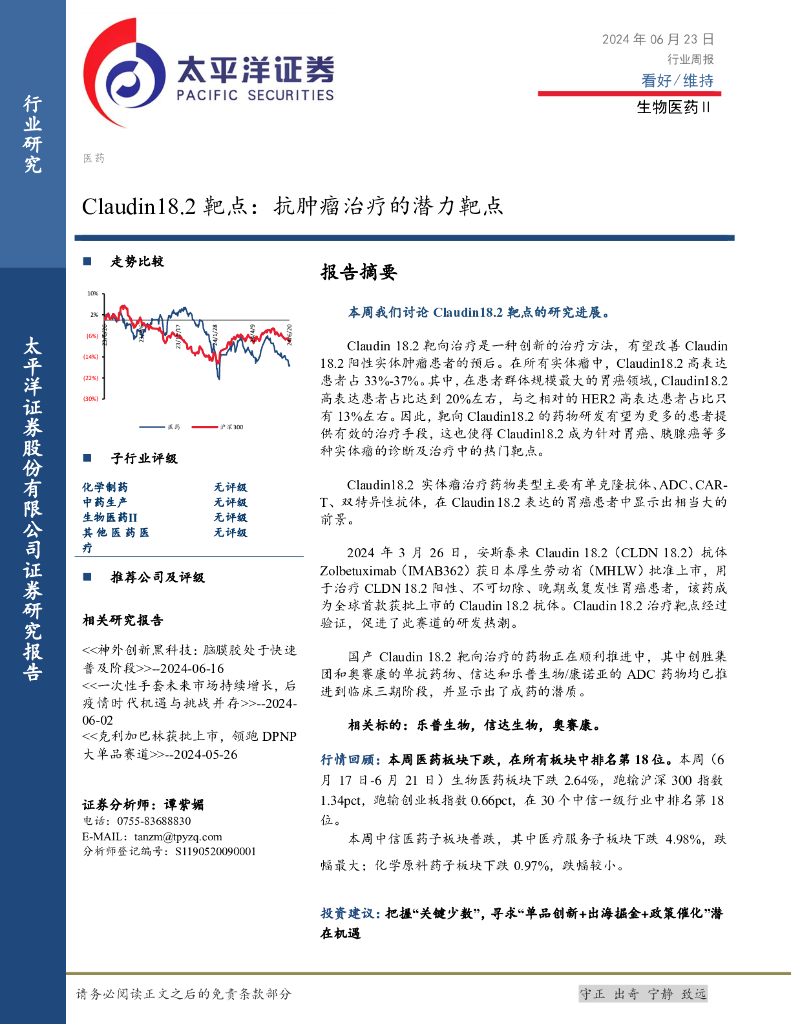 太平洋证券:生物医药Ⅱ行业周报:Claudin18.2靶点,抗肿瘤治疗的潜力靶点.pdf