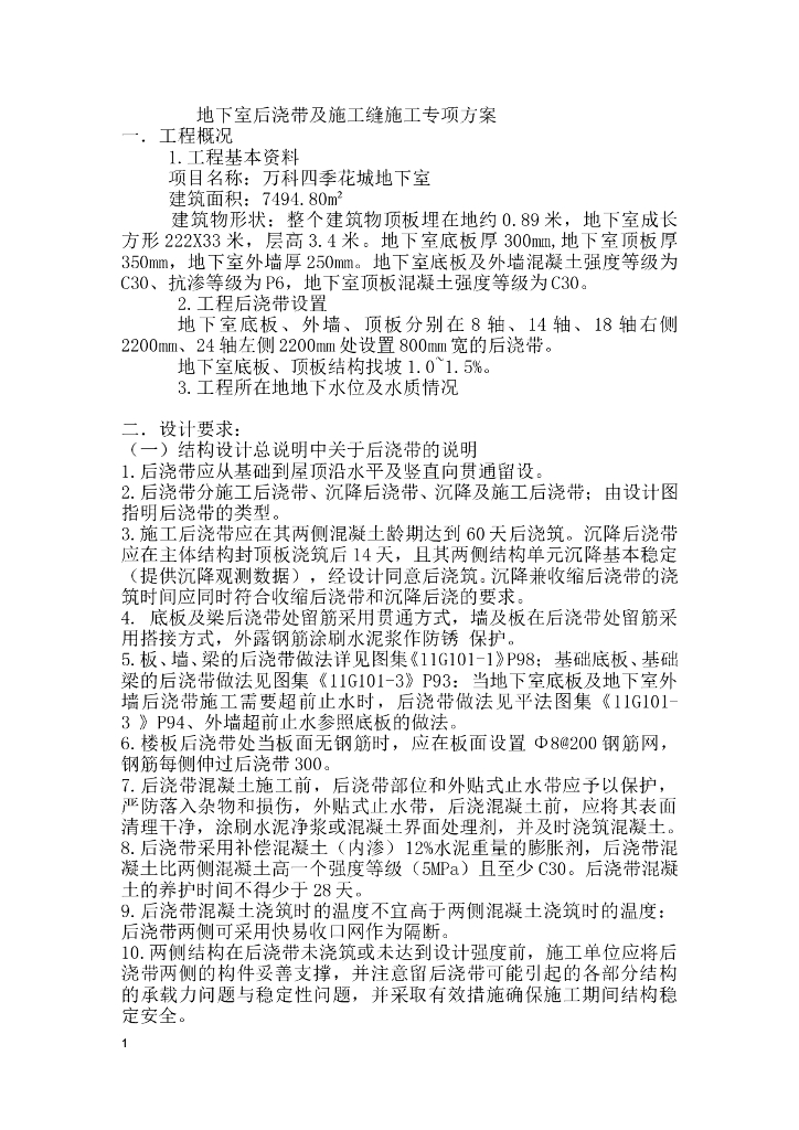 地下室后浇带及施工缝施工专项方案(多图).doc