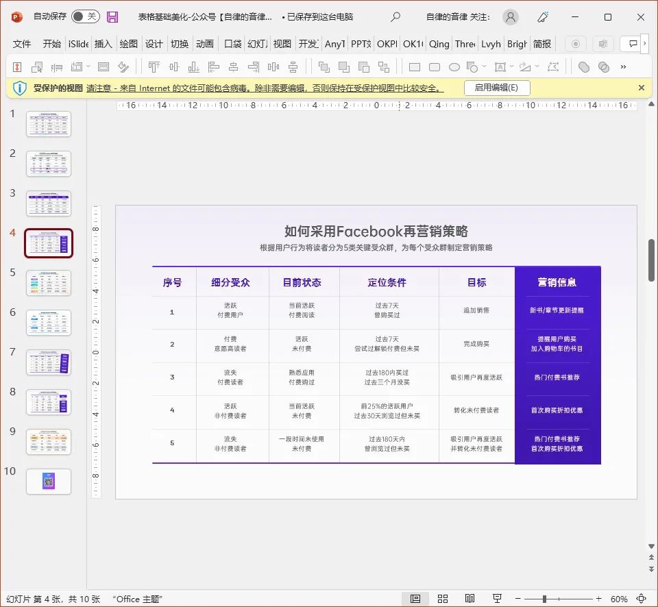 从网上下载的 PPT 文件,或者通过微信等工具接收的文件,打开后提示可能包含病毒,在受保护的视图中打开: