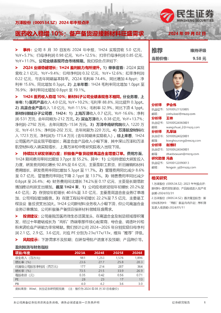 民生证券:万泽股份(000534)-2024年中报点评:医药收入稳增10%;备产备货迎接新材料旺盛需求.pdf