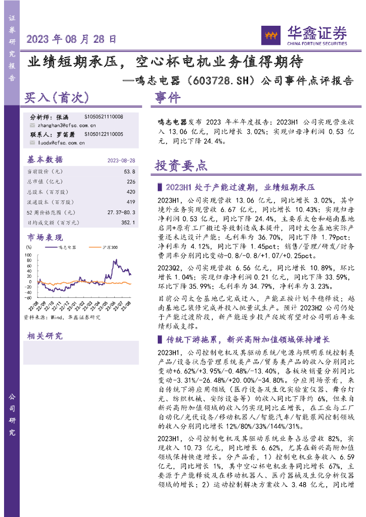 华鑫证券:鸣志电器(603728)-公司事件点评报告:业绩短期承压,空心杯电机业务值得期待.pdf