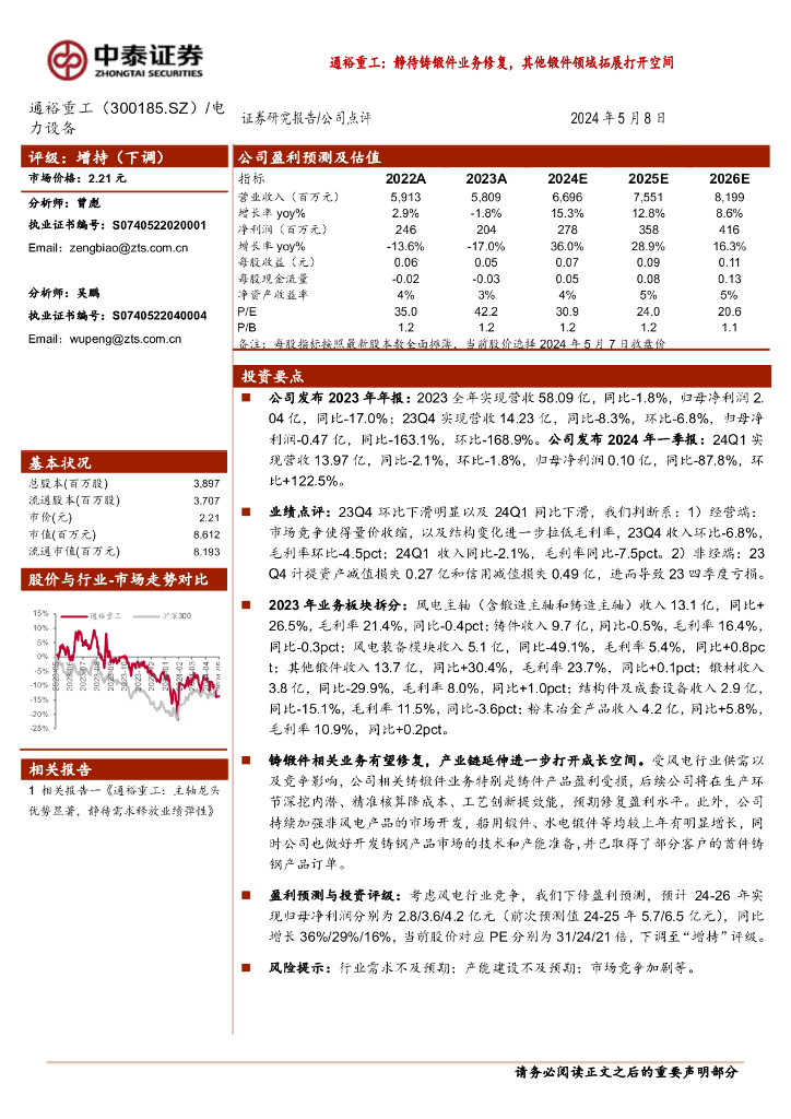 中泰证券:通裕重工:静待铸锻件业务修复,其他锻件领域拓展打开空间.pdf