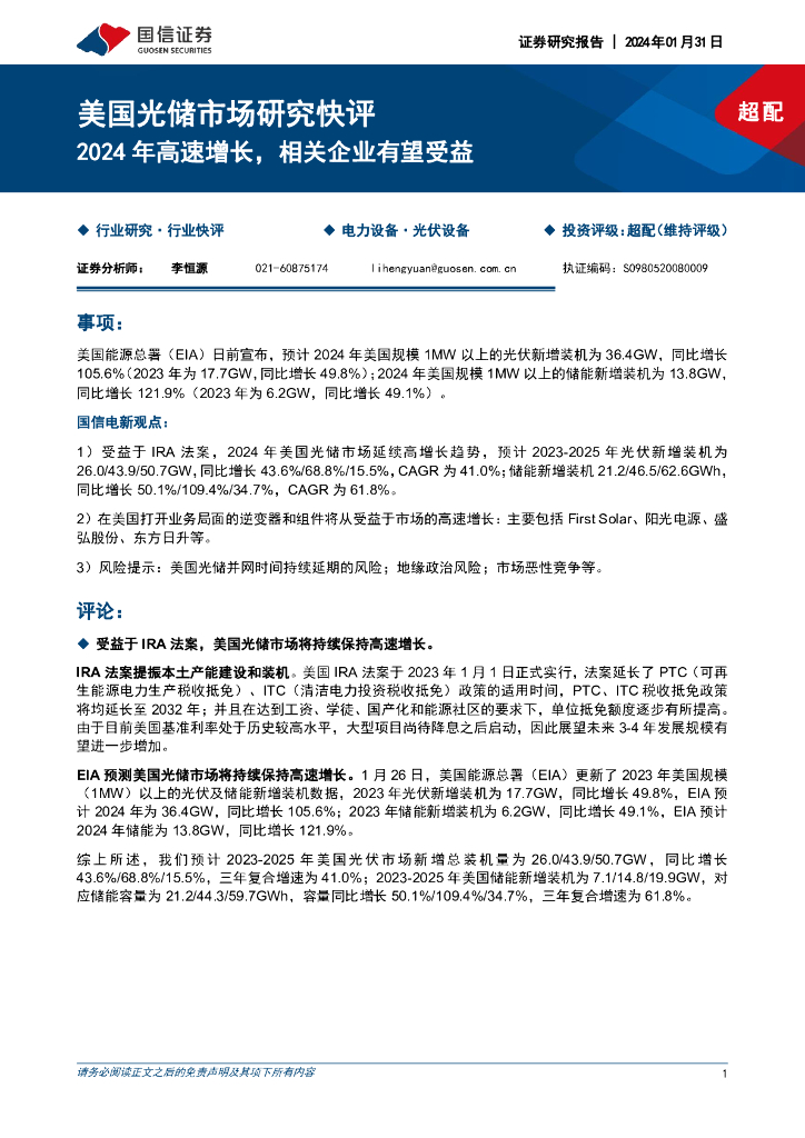 国信证券:美国光储市场研究快评:2024年高速增长,相关企业有望受益.pdf