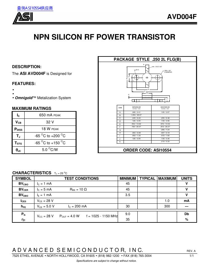 ASI AVD004F NPN SILICON RF POWER TRANSISTOR 数据手册.pdf