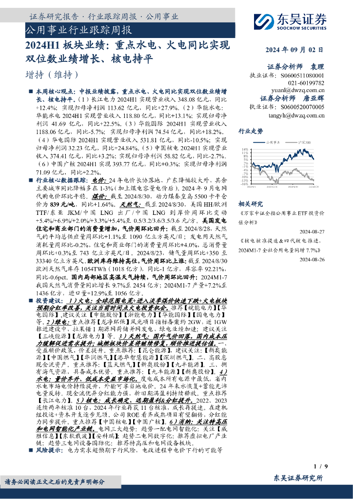 东吴证券:公用事业行业跟踪周报:2024H1板块业绩:重点水电、火电同比实现双位数业绩增长、核电持平.pdf